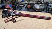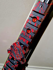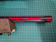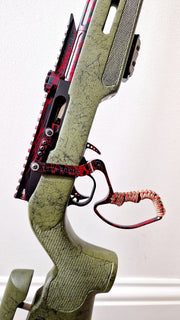 次に、この銃に搭載されたRogueWorxの見事なハードウェアは、息を呑むほど美しい赤地に黒のヴァンパイアスプラッターアルマイト加工が施されていることがお分かりいただけるでしょう。これがBLOODLUST(ブラッドラスト)という名の由来です。このパターンは、落ち着いたグリーンのストックカラーと鮮やかなコントラストを織りなしており、赤が際立ちます。