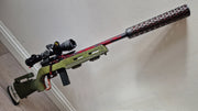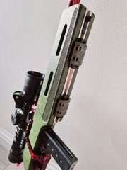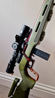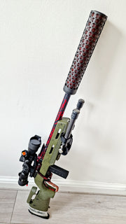 特注のEdgi 380mmラップドスチール製6.03インナーバレルを、精巧なCNC加工のストレートフルート製ヴァンパイアアウターバレルに装着し、Master Precision CNCレールとスチール製Vブロッククランプで固定することで、完璧なバレルグループを実現しました。3つのMB Oリング式バレルスペーサーで完全に安定化し、Sniper Mechanic製のFlamingo 50度ホップラバーと組み合わせることで、ホップ設定を1クリックあたり5ミクロンの範囲で微調整でき、80m以上(40mと80mでのフィールドトライアルでテスト済み)の射撃でも自信を持って命中させることができます。