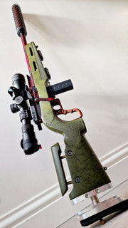 このビルドにはスコープは付属していません。写真に写っている光学機器は1000ポンド以上かかるため、あくまでもイメージとして掲載しています。ご希望であれば、ご予算に合わせて、このライフルに適した光学機器をセットし、ゼロ調整することも可能です。スコープのゼロ調整とホップ調整は、スコープのセットアップに合わせて調整いたしますので、後からご自身で調整するよりもずっと便利です。このオプションについてご相談されたい場合は、お気軽にメッセージをお送りください。