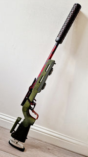 この銃はレバーアクション式(パラコード織り)で、英国エアソフトガン協会のスナイパーカテゴリーでの使用を想定して設計されており、マズルエネルギーは2.3J(0.4g BB弾使用時350fps)です。このパワーはSSBのパワースクリューで調整可能です。