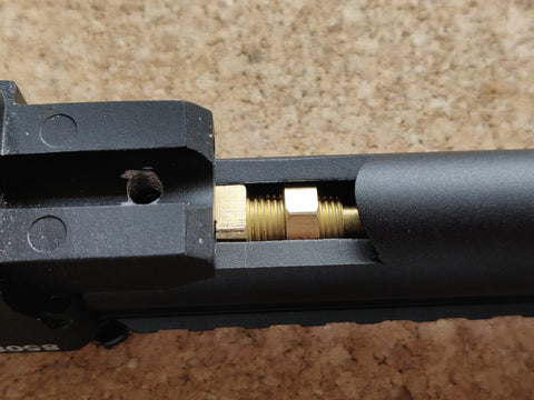 부품 번호 9번을 대체하는 황동 배럴 클램프 너트입니다. 이너 배럴을 홉업 유닛에 단단히 고정하고, 배럴이 홉업 유닛 중앙에 정렬되도록 유지합니다.