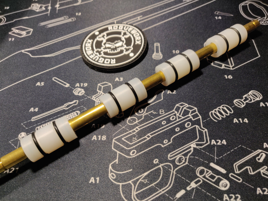 RogueWorx heeft het ontwerp verbeterd door binnen- en buiten-O-ringen toe te voegen voor een zo goed mogelijk contact met de loop. Deze zijn ontworpen om perfect in de standaard KC-02 buitenloop te passen. We raden aan om aan beide zijden van de afstandhouders zwarte isolatietape te gebruiken om te voorkomen dat ze langs de binnenloop schuiven tijdens het monteren en demonteren. We raden ook aan om wat siliconensmeermiddel op de buiten-O-ringen aan te brengen, zodat ze gemakkelijker in de buitenloop glijden. We adviseren één afstandhouder per 10 cm binnenlooplengte: een loop van 510 mm heeft 5 afstandhouders nodig, een loop van 380 mm heeft 3-4 afstandhouders nodig, enzovoort.
