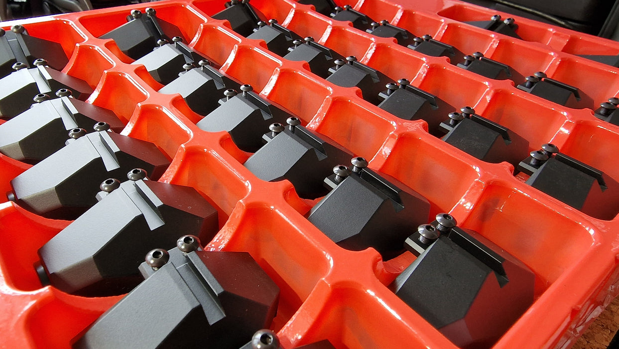 - Wkładka główna przeszła 12 iteracji projektowych, zanim osiągnęła ostateczną formę, którą obrabiamy CNC na miejscu z aluminiowego bloku 6082 w 5 operacjach. Zawiera oryginalną podkładkę amortyzującą Sorbothane, którą sprowadziliśmy z USA.