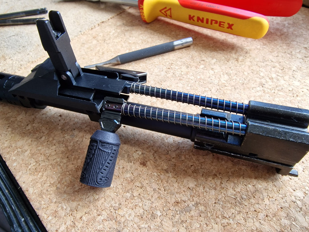 Наличие второго затворного стержня и пружины позволяет установить вторую рукоятку затвора с другой стороны вашего GHK G5 для действительно двусторонней перезарядки и взведения затвора!